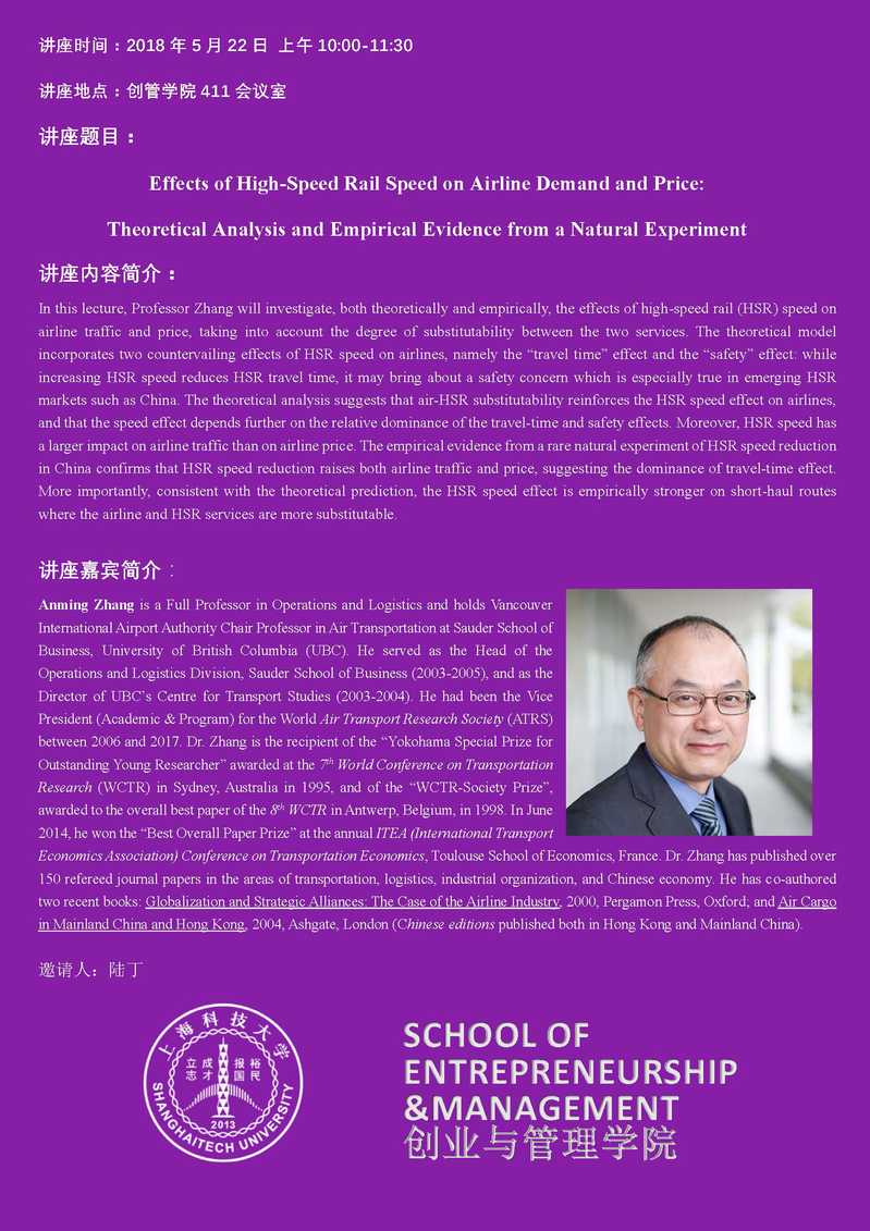 In this lecture, Professor Zhang will investigate, both theoretically and empirically, the effects of high-speed rail (HSR) speed on airline traffic and price, taking into account the degree of substitutability between the two services. The theoretical model incorporates two countervailing effects of HSR speed on airlines, namely the “travel time” effect and the “safety” effect: while increasing HSR speed reduces HSR travel time, it may bring about a safety concern which is especially true in emerging HSR markets such as China. The theoretical analysis suggests that air-HSR substitutability reinforces the HSR speed effect on airlines, and that the speed effect depends further on the relative dominance of the travel-time and safety effects. Moreover, HSR speed has a larger impact on airline traffic than on airline price. The empirical evidence from a rare natural experiment of HSR speed reduction in China confirms that HSR speed reduction raises both airline traffic and price, suggesting the dominance of travel-time effect. More importantly, consistent with the theoretical prediction, the HSR speed effect is empirically stronger on short-haul routes where the airline and HSR services are more substitutable.