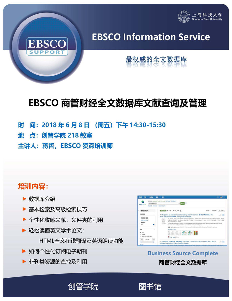 This training will mainly focus on the usage of EBSCO-Business Source Complete Informaiton Service. A Demonstration of data searching and management will be offered.