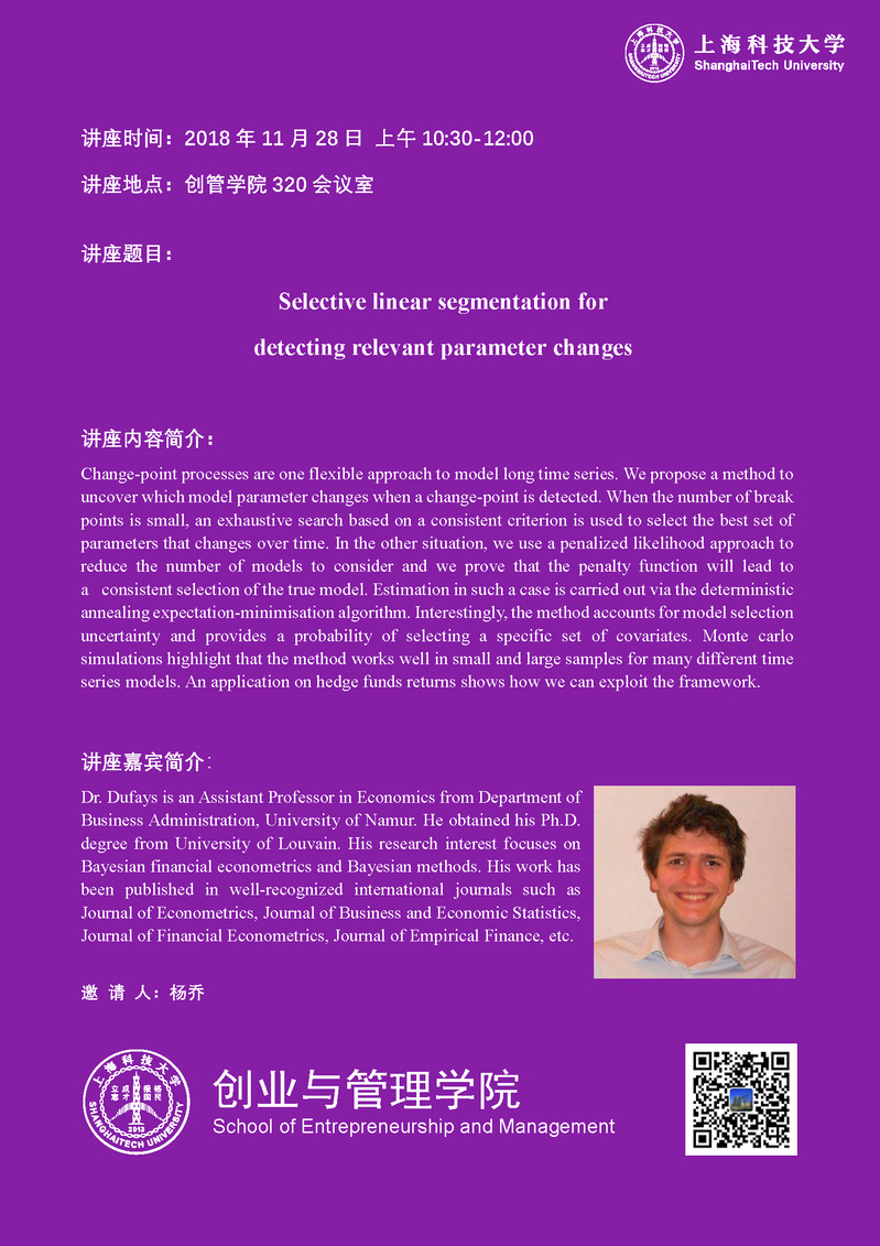 Dr. Dufays is an Assistant Professor in Economics from Department of Business Administration, University of Namur. He obtained his Ph.D. degree from University of Louvain. His research interest focuses on Bayesian financial econometrics and Bayesian methods.His work has been published in well-recognized international journals such as Journal of Econometrics, Journal of Business and Economic Statistics, Journal of Financial Econometrics, Journal of Empirical Finance, etc.