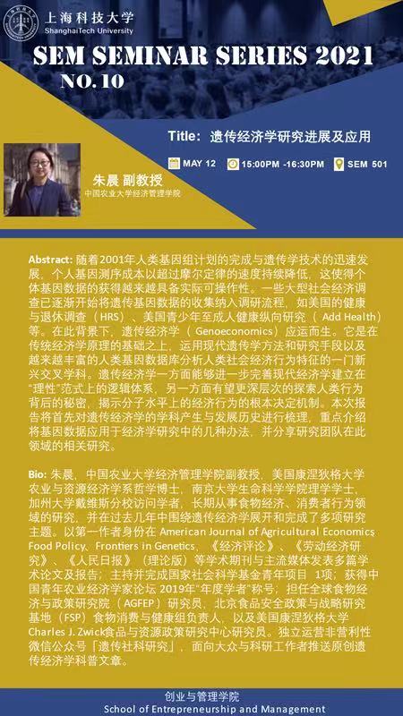 随着2001年人类基因组计划的完成与遗传学技术的迅速发展,个人基因测序成本以超过摩尔定律的速度持续降低,这使得个体基因数据的获得越来越具备实际可操作性。一些大型社会经济调查已逐渐开始将遗传基因数据的收集纳入调研流程,如美国的健康与退休调查(HRS)、美国青少年至成人健康纵向研究(Add Health)等。在此背景下,遗传经济学(Genoeconomics)应运而生。它是在传统经济学原理的基础之上,运用现代遗传学方法和研究手段以及越来越丰富的人类基因数据库分析人类社会经济行为特征的一门新兴交叉学科。遗传经济学一方面能够进一步完善现代经济学建立在“理性”范式上的逻辑体系,另一方面有望更深层次的探索人类行为背后的秘密,揭示分子水平上的经济行为的根本决定机制。本次报告将首先对遗传经济学的学科产生与发展历史进行梳理,重点介绍将基因数据应用于经济学研究中的几种办法,并分享研究团队在此领域的相关研究。